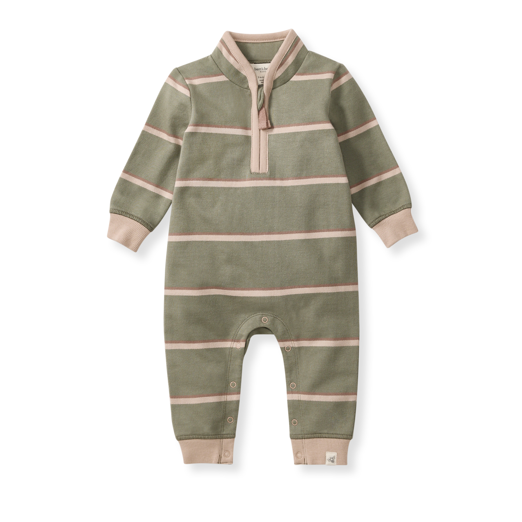 Style and comfort come together in one with our striped jumpsuit! * Long sleeve jumpsuit * 100% organic cotton * Super soft jersey cotton * Quarter zip with a collar at neckline * Cuffs on sleeves and pant legs * Snaps at diaper line for easy changes and zipper guard at neck * Made in India * Style # LY32106-TQT