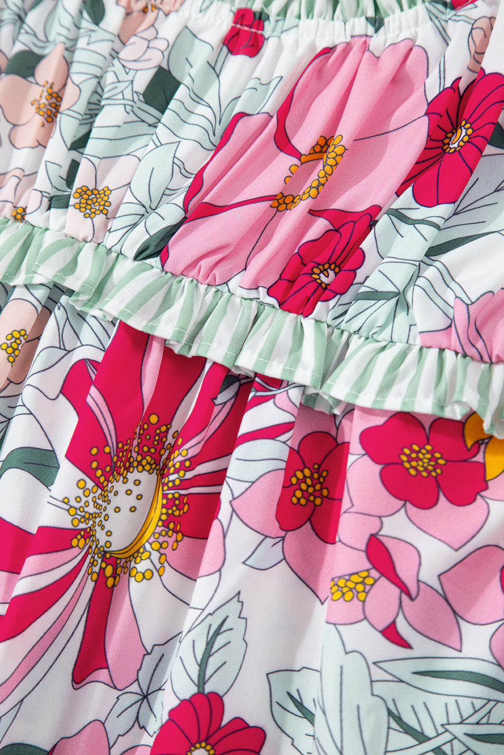 Floral Print Green Stripe Ruffles Contras Trim Cap Sleeve Blouse